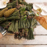 Twist all the wires together creating a bouquet holder. Cover the bouquet holder with green corsage tape. Then cover it with double sticky tape and camouflage the holder with pine needles. Finally, twist some wire around the holder.