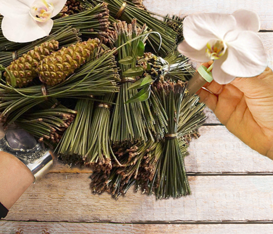 Assemble bunches of needles and cones creating round tight bouquet, and then add two blossoms of orchids.