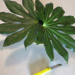 Start with large fatsia Japonica leaves, camouflaging the floral foam. Place leave stems next to each other in the center of the foundation. The radial veins of these compound leaves would help direct to the center of the foam foundation the other flowers ad leaves.