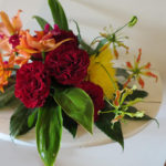Gloriosa flowers are available at the market in wines or as single blossoms. A flower stem is only about 5-6 inches; to create a larger arrangement, using wines with blossoms on them.